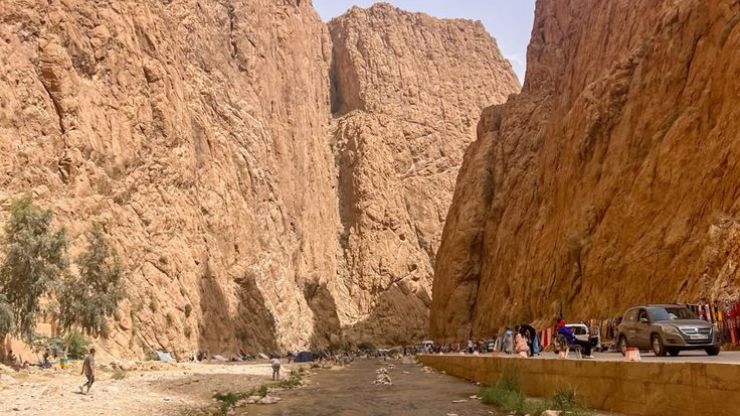 Cross briefly into the film set of Ouarzazate before continuing into the Dades Valley. As the afternoon sun sets, drive along the Road of a Thousand Kasbahs into the Dades Gorge, a canyon of rust-colored cliffs. The sheer rock walls glow sunset gold along the river.